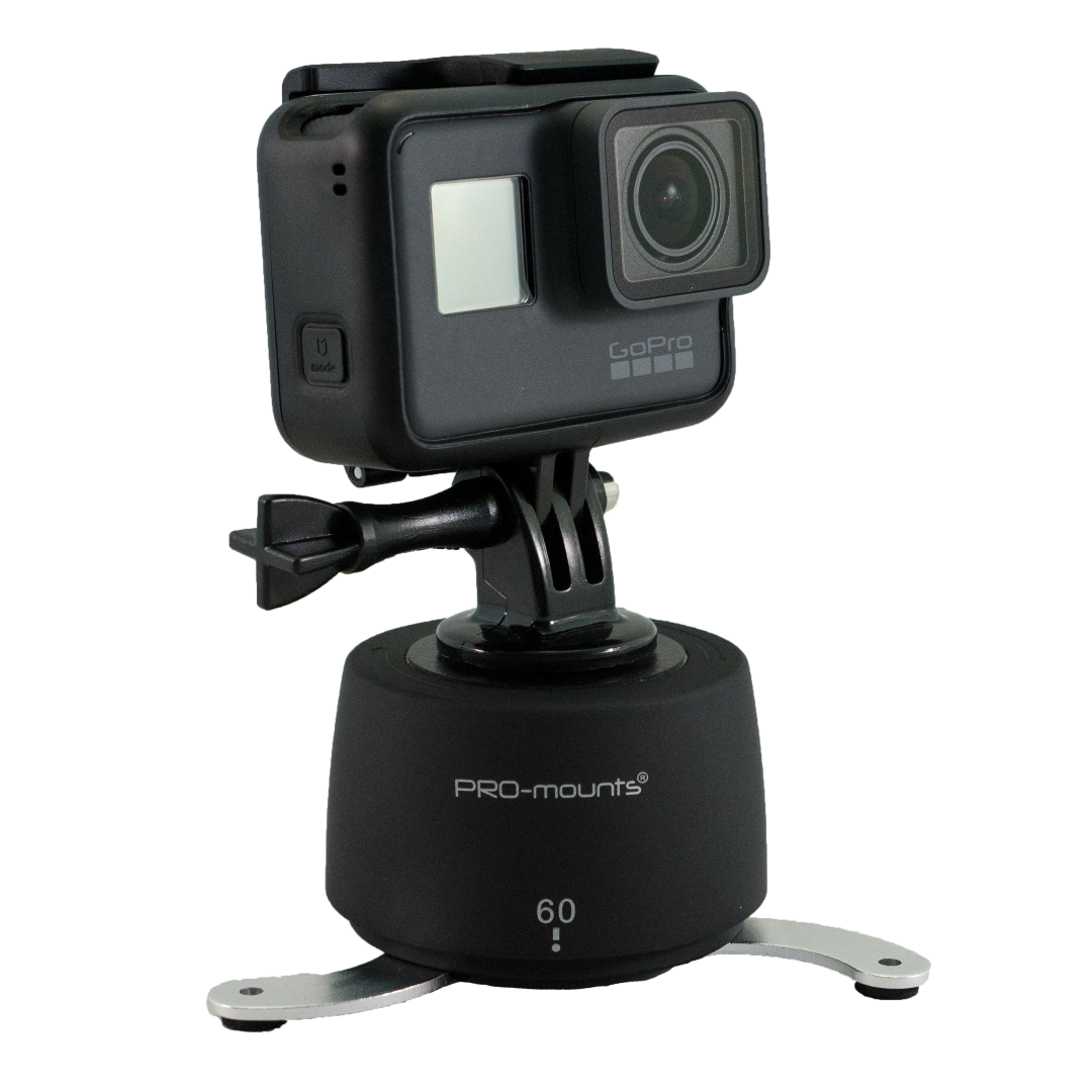 The PRO-Mounts PRO-lapse (Time Lapse) is small in size but large in use. You do know them, those beautiful time lapse recordings from films in which you see, for example, a city skyline passing in 180 ° or a setting sun from left to right. Most Actioncamera’s have a so-called Time Lapse option, with Time Lapse your camera takes photos and no video, when played this gives a kind of accelerated recording effect, for example a setting sun that normally lasts 3 hours can you (accelerated) ) in 5 minutes. The PRO-mounts PRO-lapse adds the possibility that you can gradually rotate your Actioncam 10 to 360 ° during recording, a full 360 ° takes 60 minutes and with half an hour you can record a make a full 180 ° shot.
